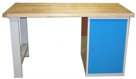 pracovní stůl - jednostranný, stůl má vlevo nohy, vpravo jednodveřový kontejner, deska z bukové spárovky, tl.40mm, PÚ - šedomodrá kombinace RAL 7035/5012 uvnitř kontejneru jsou 2 výškově přestavitelné police, vnitřní strana dveří se systémem PERFO, uzamykání cylindrickým zámkem se 2 klíči |