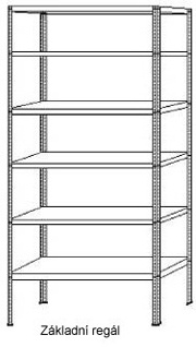 šroubovaný regál základní - lakovaný, 4 stojky, 6 polic, nosnost 150 kg/polici prášková barva v odstínu bílém RAL 9003 nebo ve 3 odstínech šedé RAL 7040, 7032, 7035 |