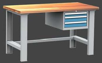 pracovní stůl základní s podvěsným 3-zásuvkovým kontejnerem, deska z bukové spárovky, tl.40mm, PÚ - šedomodrá kombinace RAL 7035/5012 3-zásuvkový kontejner, výšky čel: 2x 90 + 1x 60mm, centrální uzamykání cylindrickým zámkem se 2 klíči |