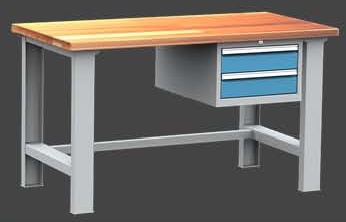 pracovní stůl základní s podvěsným 2-zásuvkovým kontejnerem, deska z bukové spárovky, tl.40mm, PÚ - šedomodrá kombinace RAL 7035/5012 2-zásuvkový kontejner, výšky čel: 2x 120mm, centrální uzamykání cylindrickým zámkem se 2 klíči |