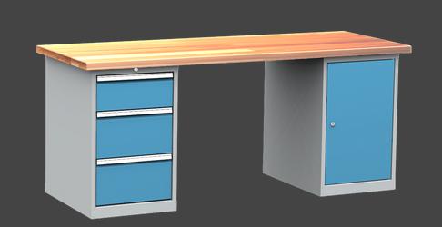 pracovní stůl, vpravo kontejner s dvířky, vlevo kontejner se 3-mi zásuvkami, deska z bukové spárovky, tl.40mm, PÚ - šedomodrá kombinace RAL 7035/5012 | |
