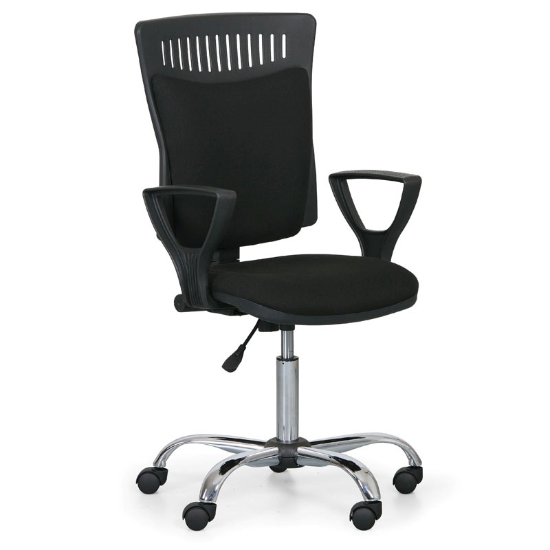 Kancelářská otočná židle - plynulé nastavení výšky plynovým pístem - kloubové nastavení zádové opěrky s permanentním kontaktem - s područkami - čalounění 100 % polyester, gramáž 360 g/m2, 40 000 cyklů - chromovaný kříž - tvrdá kolečka pro měkké podlahy - nosnost 90kg |