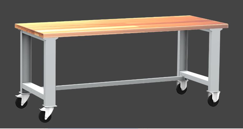 pracovní stůl - základní, stůl má 2 kola pevná + 2 kola otočná s brzdou + 1 spojnici + desku z bukové spárovky 40mm, PÚ - šedý lak RAL 7035 | |