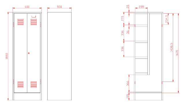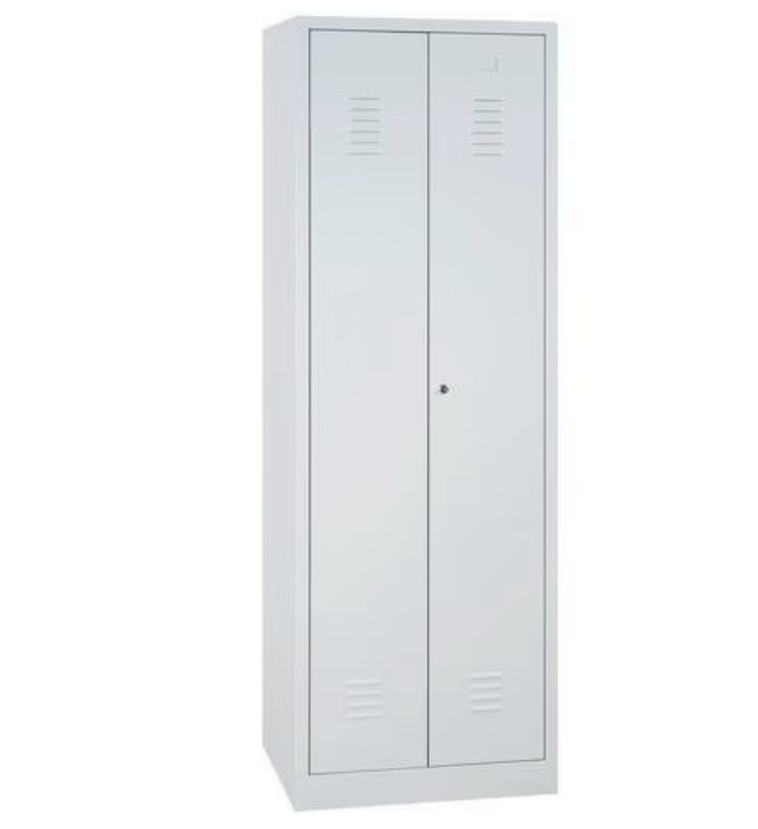 vnitřní výbava kovové skříně: vlevo policový oddíl - police nejsou až dolů, ve spodní části v celé šíři volný prostor, dvoukřídlé dveře s odvětráním a výztuhou, PÚ - šedý lak RAL 7035
